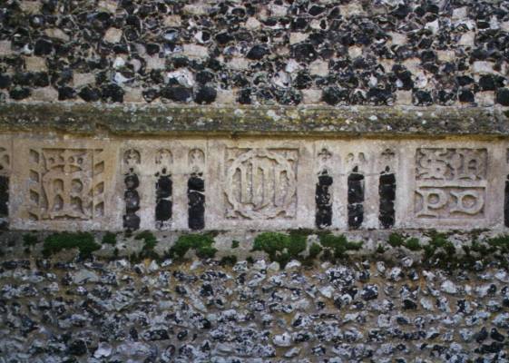 the west face four panels; (left to right) the interwined letters ST (Sancta