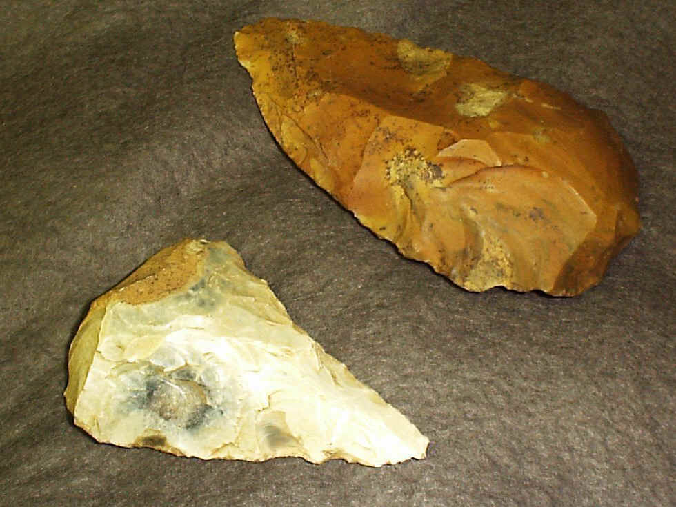 The Stone Age In Santon DownhamThe Palaeolithic Period. 500,000-8000 BC.Santon Downham is one of the most important and earliest known sites of human occupation in Britain. Many hand-axes have been recovered from river gravels that formed when, after the major glaciations, the drainage pattern was assuming its present form. Hand-axes are heavy pointed or ovate tools used for butchering and other purposes. Henry Prigg found the first hand-axe in 1865. Many hundreds were found within a few years, and continued discoveries were made up until 1910. They include numerous elegant specimens in fresh condition and justify J. Evans statement that some of them afforded 'the finest instances of the skill of the Palaeolithic period which has been found in Britain, or elsewhere.' Today, these ancient tools are in the collection of many nationally important museums but sadly very few are on display to the public.